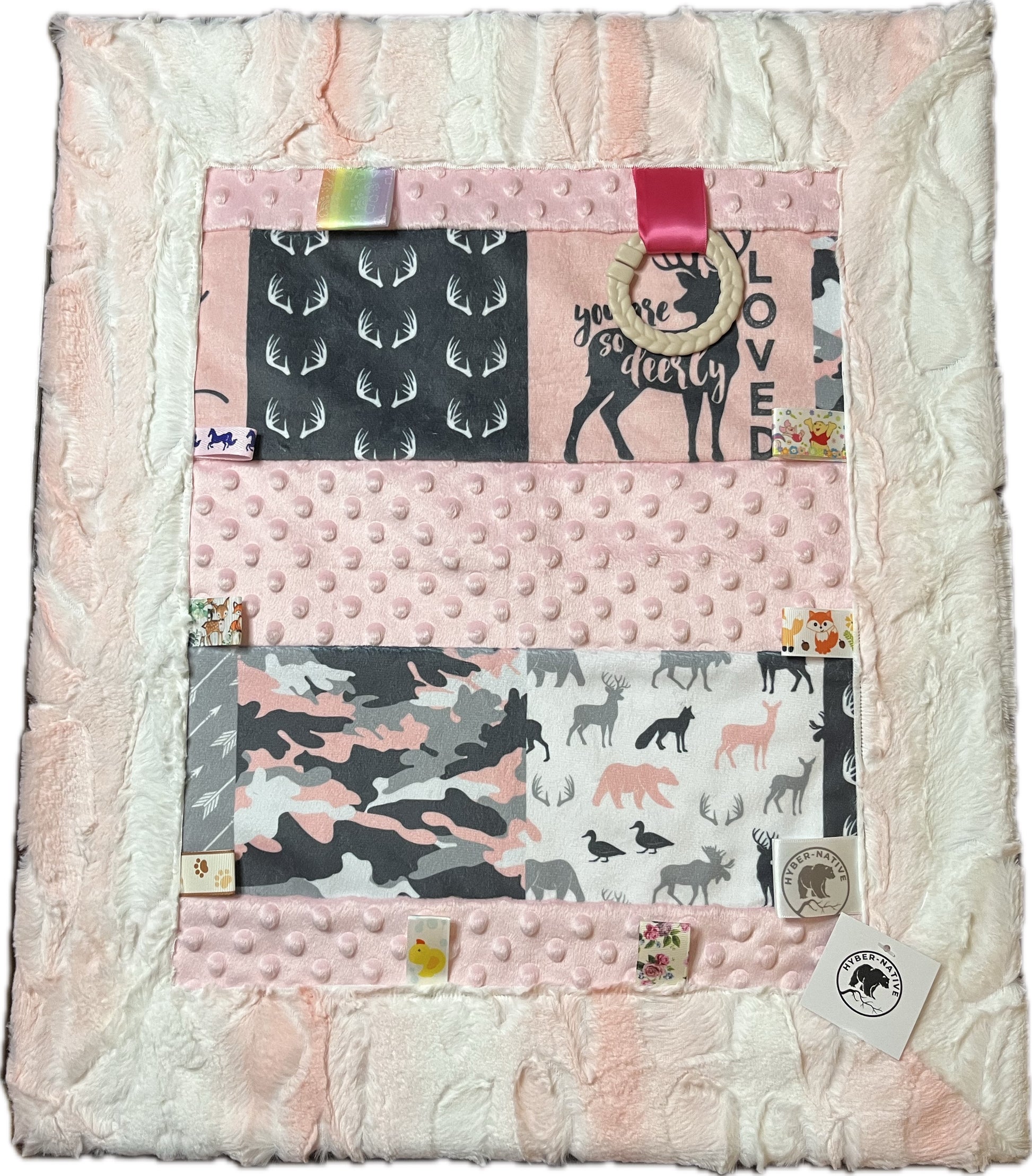 Warm and snuggly textures and tags, our CubTags are just like their larger counterparts but just the right size for on-the-go. Measuring approximately 20" wide by 24" long and made of high-quality minky and cuddle fur, they're a "go anywhere" solution for parents and infants. And don't forget the attached link toy for easy carrying.