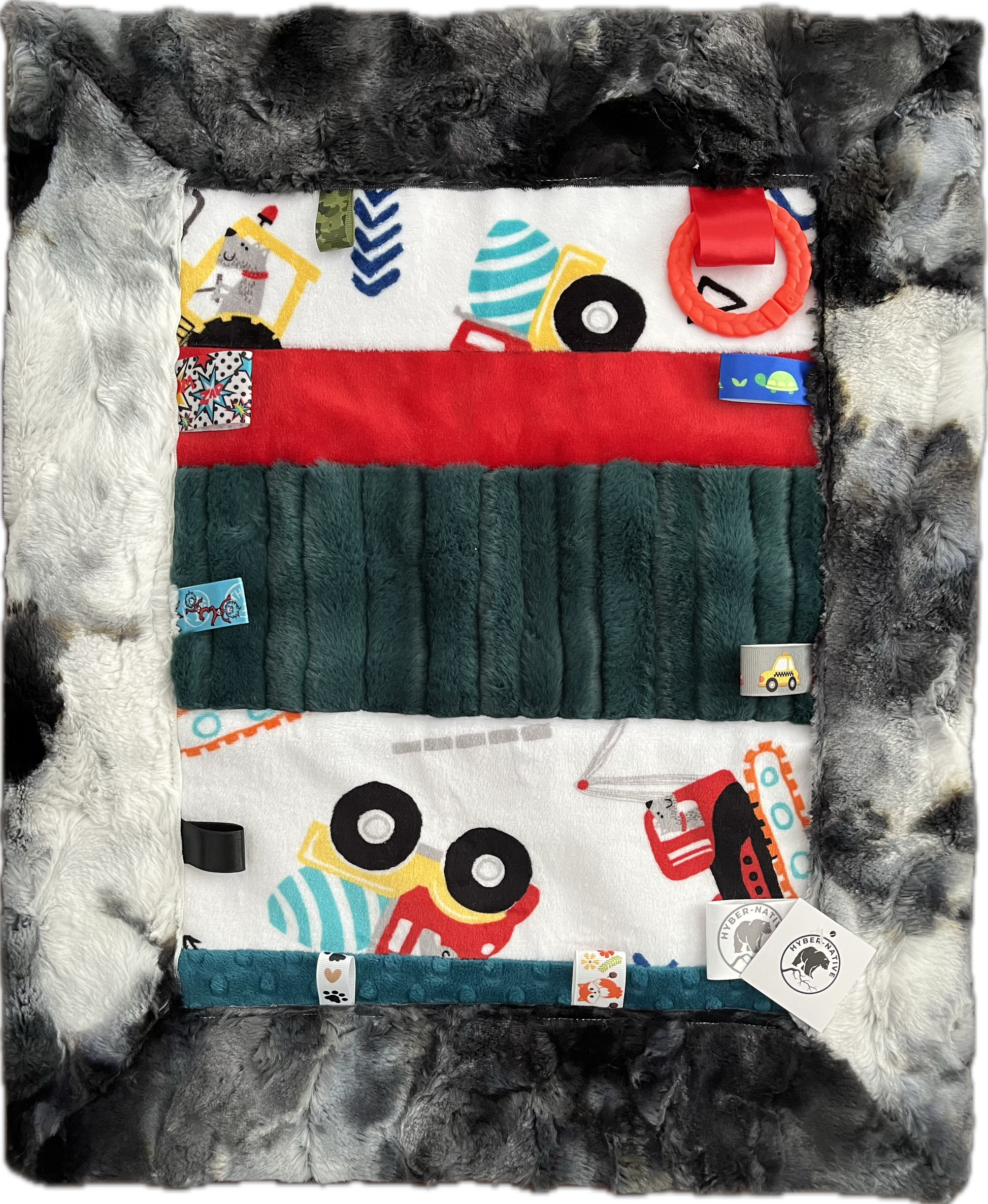 Warm and snuggly textures and tags, our CubTags are just like their larger counterparts but just the right size for on-the-go. Measuring approximately 20" wide by 24" long and made of high-quality minky and cuddle fur, they're a "go anywhere" solution for parents and infants. And don't forget the attached link toy for easy carrying.