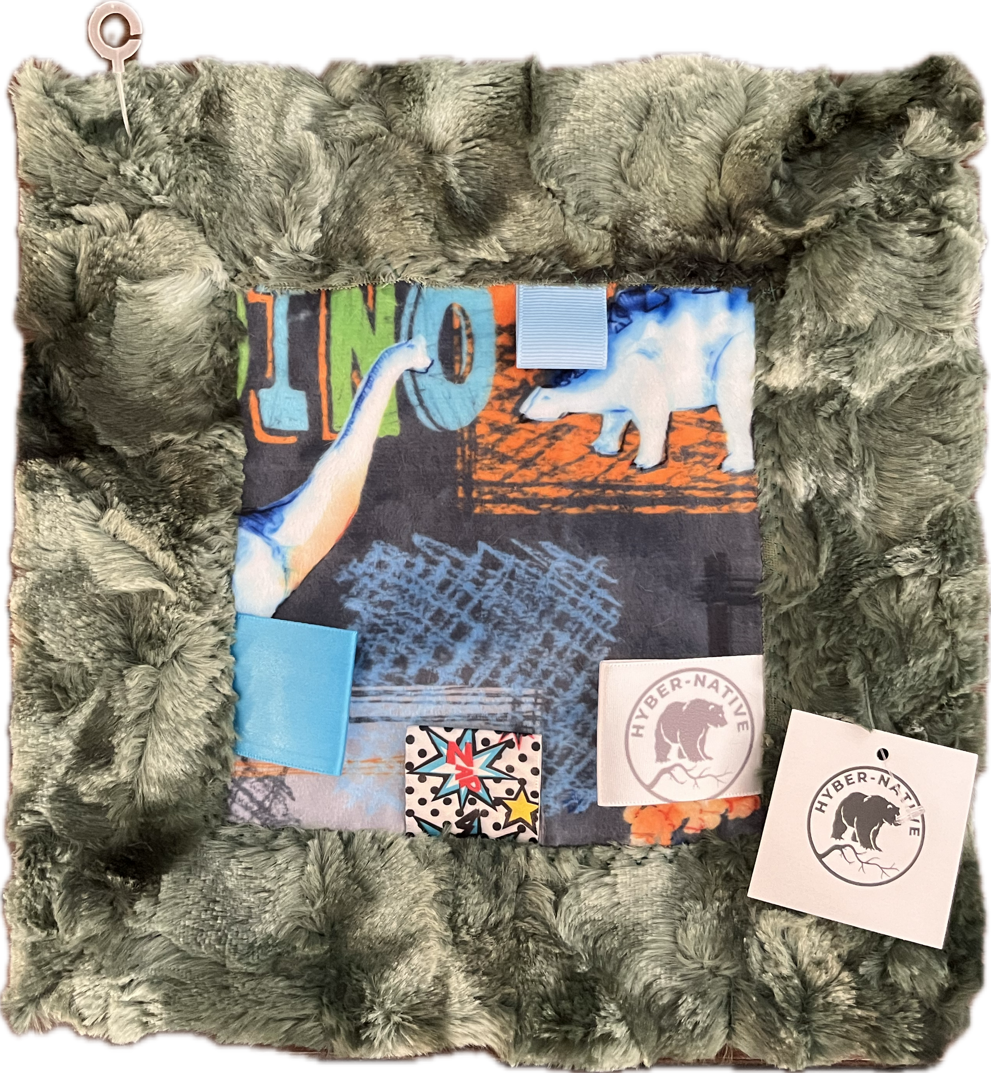 Our take on loveys, the Hyber-Native Fidget is the perfect carry-around comfort product for tiny hands. Measuring approximately 10" x 10", Fidgets are made from the same extravagant minky as their larger, Hyber-Native counterparts. We complete the sensory adventure with tags and crinkle fabric in the the middle. Perfect for every little human!
