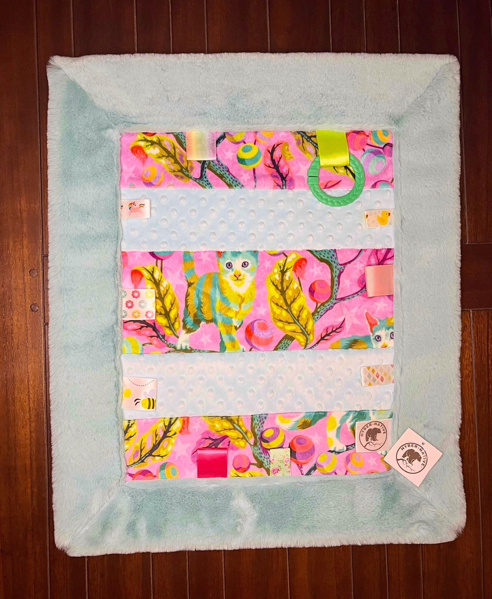 Warm and snuggly textures and tags, our CubTags are just like their larger counterparts but just the right size for on-the-go. Measuring approximately 20" wide by 24" long and made of high-quality minky and cuddle fur, they're a "go anywhere" solution for parents and infants. And don't forget the attached link toy for easy carrying.